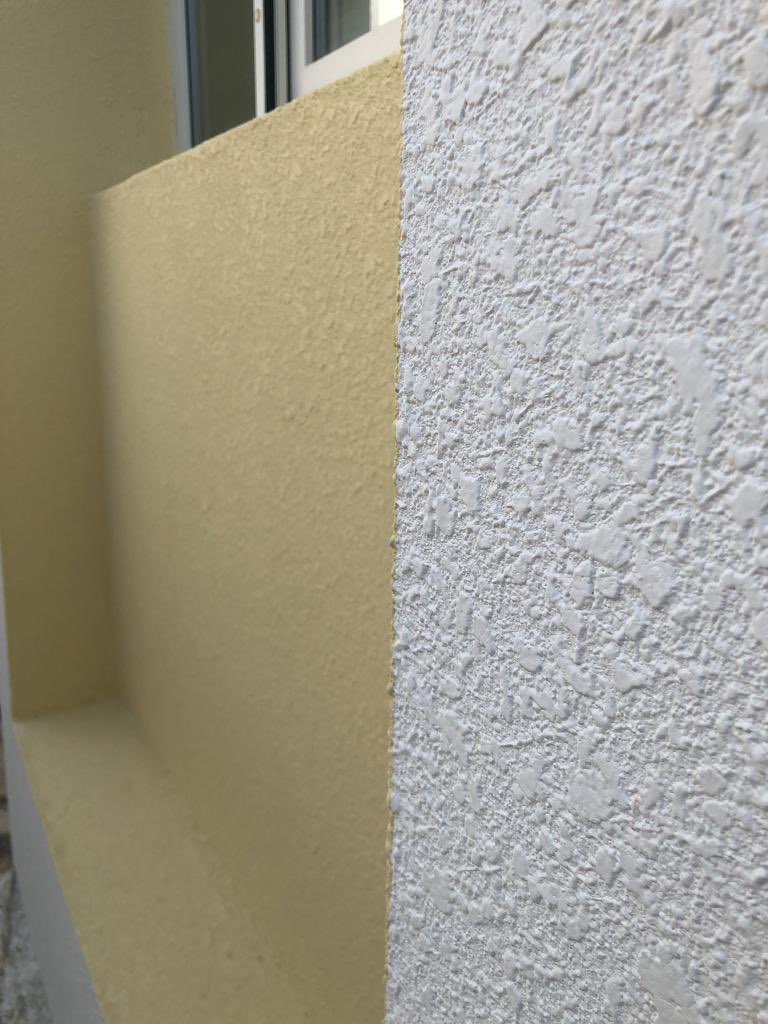 - وبعد الانتهاء من طبقة اللياسة يتم وضع طبقة رشه امريكيه محببه ذات لون ابيض باستخدام أدوات دهانات متخصصة مثل مسدس رش خاص للرشات المحببة